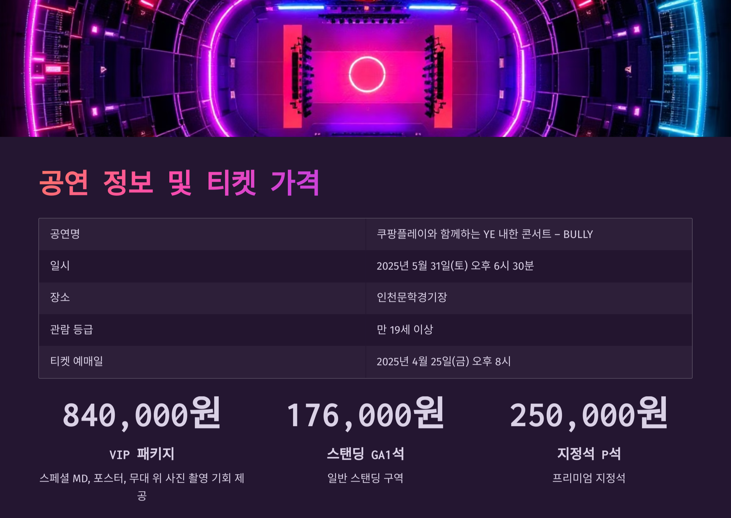 | 티켓 예매 | 2025년 4월 25일 (금) 오후 8시 |